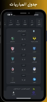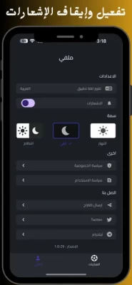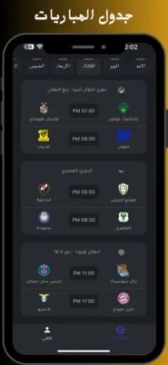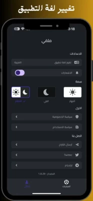 إبقَ على إطّلاع بنتائج ومواعيد مباريات فرقك المفضلةخاصية تغيير السمة من ( وضع ليلي أو نهاري ) أو إبقائها تلقائية حسب النظامتغيير لغة التطبيق من اللغة العربية إلى اللغة الإنجليزية والعكسإمكانية تفعيل أو إيقاف الإشعارات