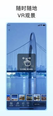 全景图内可通过左右滑动手势转动全景观看角度,全景图内置锚点,某些具有东南西北锚点可按照拍摄驻点作为中心,像各个方向进行移动;场景切换触发锚点,可通过点击跳转锚点切换场景,全景图下方具有该地点全景所有场景切换视图,点击即可轻松切换不同场景,完美模拟景区移动。