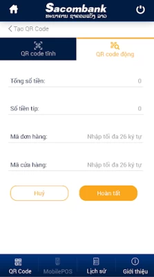 Phones, tablets…which are connected to 3G/WIFI/GPRS. Developed by Sacombank Lao. Service: • Can make QR code by myself • Transition managementd