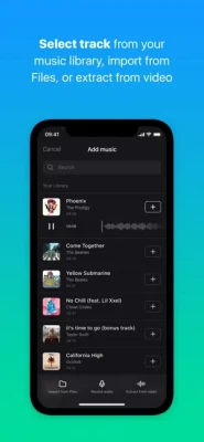 Video Music Adder by Clideo allows not only uploading a soundtrack from your Library or iTunes, but also recording your own sound or extracting audio from any video.