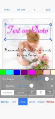 ◇ How to use 1. Tap "Background" button to add a photograph 2. Tap the "Add Text" button to add a text 3. Edit color/style, font size, font name 4. Add an outline to the text 5. Resize, rotate and move the text
