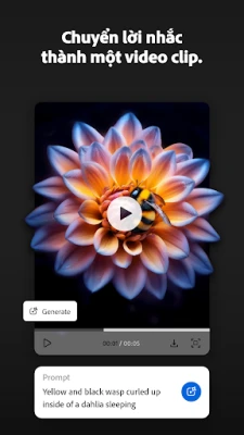 • Tạo video từ văn bản: Sử dụng các mô hình AI hàng đầu và trình tạo video AI của Firefly để biến câu lệnh văn bản thành video clip. Tạo hình ảnh và lựa chọn độ phân giải cùng tỷ lệ khung hình phù hợp với nhu cầu sáng tạo của bạn.