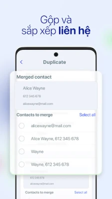• Gộp các số trùng lặp thành một liên hệ để giữ danh bạ của bạn được sắp xếp gọn gàng
