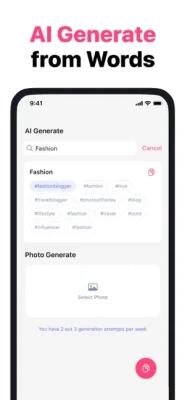 Find your perfect hashtag here and stand out on social media! Simply upload your photo, and our AI algorithms will suggest the most popular hashtags that allow you to gain more followers and likes. Use this hashtags app for your social pages to be on the top. Create captions for photo or video posts with tags, or add them to any other content you like.