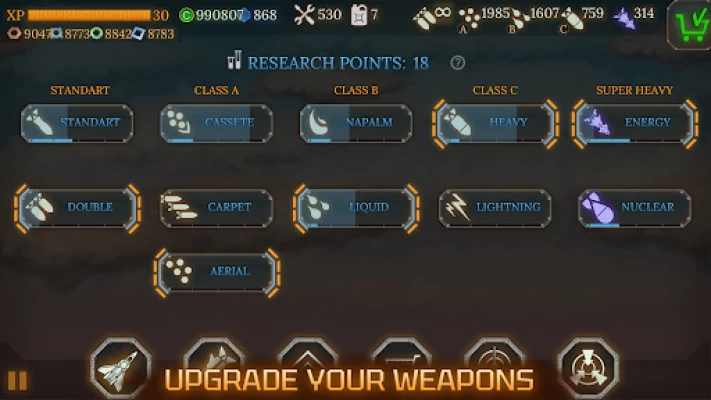 Choose weapons, buy new planes, buy different types of bombs, become stronger!