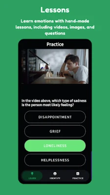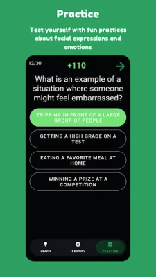 Use the Practice section to apply what you learned in the Learn section. Answer questions of various types, and earn points for correct answers and streak bonuses. Learn to identify facial expressions and understand emotions, their sensations, causes, etc.
