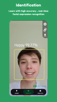 Improve your learning with the Identify section. See how emotions arise in real-life by using your device's camera to identify the facial expressions of yourself and others.