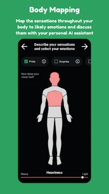 Describe how "light" or "heavy" you feel in various body parts to get predictions of emotions you feel along with their descriptions. Select the ones you feel and discuss with your AI Assistant.