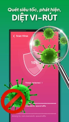 - Chỉ với thao tác đơn giản, app quét virus trong điện thoại nhanh chóng phát hiện, diet virus dien thoai, trojan, cảnh báo phần mềm gián điệp không an toàn có thể đánh cắp thông tin và dữ liệu quan trọng từ điện thoại.