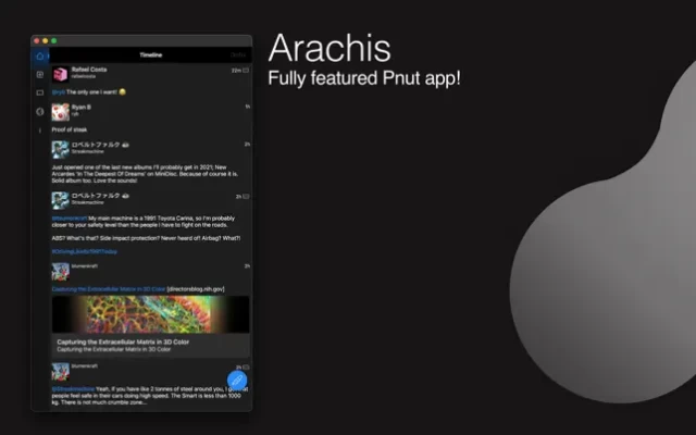 With Arachis, you can publish GIFs (either from GIPHY* or record one yourself), add images via pnut Files, and much more.