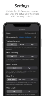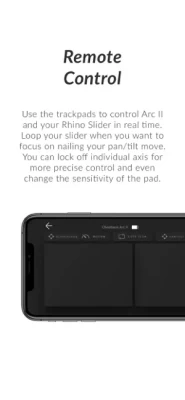 Remote Control - Use the trackpads to control Arc II and your Rhino Slider in real time. Loop your slider when you want to focus on nailing your pan/tilt move. You can lock off individual axis for more precise control and even change the sensitivity of the pad.