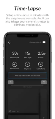 Time-Lapse - Setup a time-lapse in minutes with the easy-to-use controls. Arc II can also trigger your camera’s shutter to eliminate motion blur. Note: shutter triggering requires a shutter release cable that can be purchased on our website.