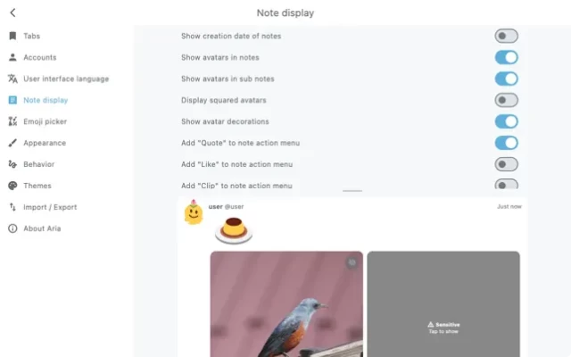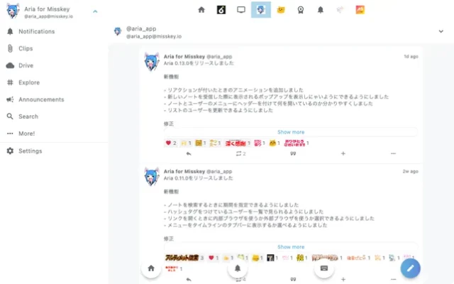Aria supports most of the functions available in Misskey, including viewing various types of timelines, posting notes, editing clips, lists or antennas, etc.