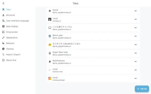 Aria makes it easy to view different timelines by saving the timelines you want to view as tabs. Adding any account's timeline to a tab makes it easy to follow topics across servers.