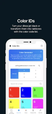 Use the list to get a color’s ID, or tap a color to place it into the setTargetDinoColor command generator, which will output a working command for you to use on dinos in-game.