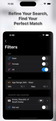 3. Filter by preferences based on Gender, Age, Country or find matches nearby your location.