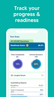 Additionally, our mobile app provides a personalized study plan based on your skill level, study frequency, and target test date. Not sure when you want to take the exam? You can adjust your study plan as often as you like. Our proprietary readiness score will help you determine when you’re ready to take the real Armed Services Vocational Aptitude Battery exam and pass with a high score on your first try.