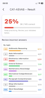✓ Topic-Based Training – Drill weak areas: General Science, Arithmetic Reasoning, Word Knowledge, Paragraph Comprehension, Mathematics Knowledge, Electronics Information, Auto & Shop Information, Mechanical Comprehension