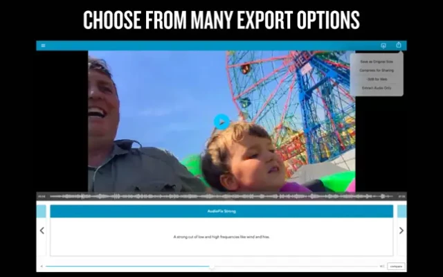 We never overwrite your original file. Save as new at the same resolution. Use Audio Fix to reduce video size for easy sharing. Use Audio Fix to mute your video. Plenty of options!