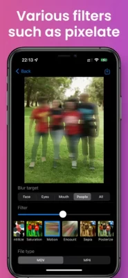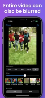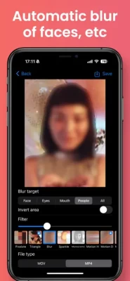 This app can automatically recognize the face, eyes, mouth, and person (whole body) of a video and apply blur.In addition to blur, you can also use- Pixelate- Monochrome- Glitter- Shake- Dotting- Sepia