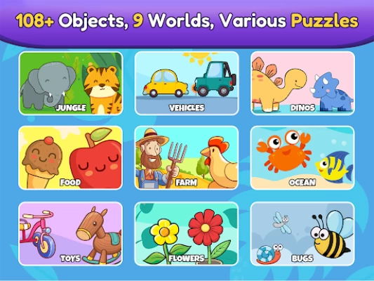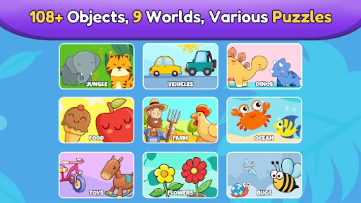 With Baby Puzzle Games for Toddlers, kids can discover 100+ different objects across 9 puzzle categories – from Dinosaurs, food, farm, domestic and wild animals, fish & sea life, to toys, flowers, plants and bugs.