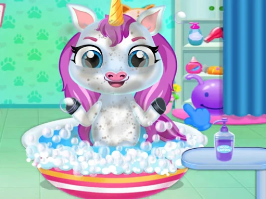 Give your baby unicorn a soapy bath in the bubbling water. Baby unicorns love water so apply soap before washing her with water. Clean your pet and make its rainbow horn look extra cute by properly cleaning it this pony game.