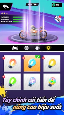Các tùy chọn tùy chỉnh: Cá nhân hóa người lái của bạn bằng nhiều loại mũ bảo hiểm, trang phục và phụ kiện. Nổi bật trên đường đua khi bạn cạnh tranh để giành chiến thắng.