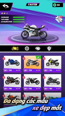 Nhiều loại xe mô tô: Chọn từ nhiều loại xe mô tô, mỗi loại có thông số kỹ thuật và đặc điểm xử lý riêng. Nâng cấp và tùy chỉnh xe đạp của bạn để phù hợp với phong cách đua xe của bạn.