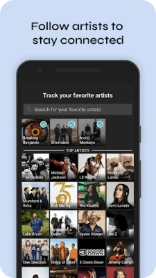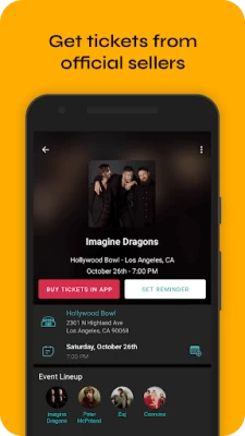 Follow your favorite artists or sync services like Spotify to stay connected and receive alerts when they announce shows near you, and even request a tour stop in your town. Set reminders, get tickets from official sellers, and read reviews before you go.