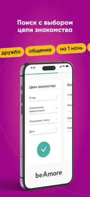 beAmore is a dating app where you can choose who you want to meet. Two types of subscription FREE (with limited functionality) and PREMIUM (without restrictions) provide access to dating with a quality audience, without bots and advertising, where you choose the purpose of your relationship: starting a family, online dating, weekend relationships, one-night stand , friendship, communication by interests and others. At beAmore, you are sure to find someone who shares your goals and values. We care about our users, so we have put up a reliable barrier against bots and fake accounts in order to gather a high-quality audience from those for whom it is important to find, and not be in search.