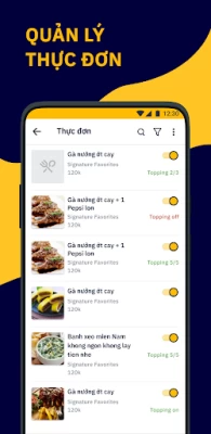 - Quản lý menu: Thiết kế menu bằng cách tự tạo món, cập nhật giá bán, hình ảnh món, trạng thái còn/tạm hết món trên thực đơn.