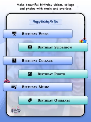 This app helps you to create beautiful birthday portrait, birthday slideshow with music and birthday video with advance editing features.