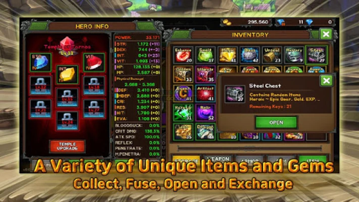 Tìm chiến lợi phẩm hiếm và trang bị cho anh hùng của bạn.
