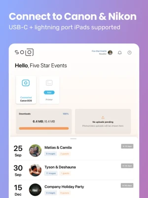 Booth.Events is the first photo booth app that can connect directly to your Canon EOS, Nikon, or Sony camera via USB (lightning and USB-C iOS devices supported). You can also use your device camera with as much or as little manual control as you prefer.