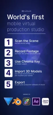 Use it free with export to HitFilm (.hfcs) and Blender (.py) and a single point anchor. Upgrade to export to After Effects (.jsx), Apple Motion (.motn), Autodesk (.fbx), Plain Text (.json, .csv) where you can complete your post-production workflow, add multiple anchor points to your scene, and access chroma key and 3D model import options for the full mobile virtual production experience.