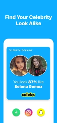Answer questions like " Which celeb do I look like?" or "Who do I resemble?" with Celebs. With our improved accuracy and faster comparisons, you can now easily find your celebrity lookalike and share your results with friends on Instagram and Snapchat. Create fun stories with your celebrity matches and see who your friends think you look like!