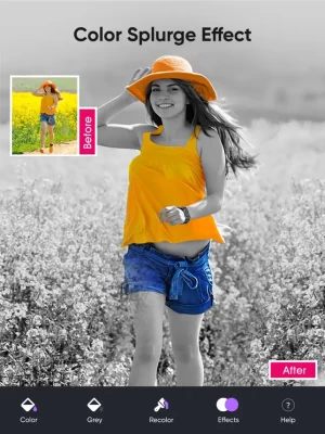 Color Splurge is a photo editor thats Lets you Selective De saturation(Popularly known as selective coloring and recoloring Effect) and Colorize your photos and generate high quality images.No matter how big is the image it lets you generate the High quality output.It is fully integrated to social networks like Facebook.