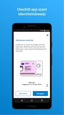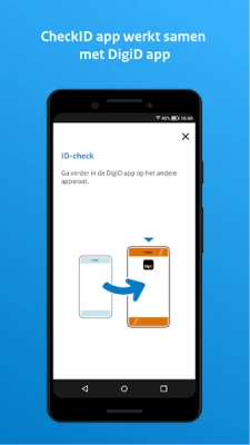 Met de CheckID app van DigiD kunt u voor iemand anders een eenmalige controle van een identiteitsdocument uitvoeren. De controle vindt plaats door de chip op het Nederlandse rijbewijs of identiteitsdocument uit te lezen met behulp van de NFC-lezer op uw toestel. De CheckID app leest het documentnummer, de geldigheid en de geboortedatum uit van een identiteitskaart, of het rijbewijsnummer van een rijbewijs uit. Deze gegevens worden via een beveiligde verbinding verzonden naar de DigiD app waarvoor de ID-check wordt uitgevoerd. De CheckID app verwerkt voor deze controle geen gegevens van het toestel waar deze op geïnstalleerd is.