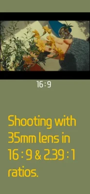 • Using 35mm focal length lens. • 16:9 & 2.39:1 aspect ratio with top and bottom black letterboxing. • Photo grid feature included. • Day stamp feature included.
