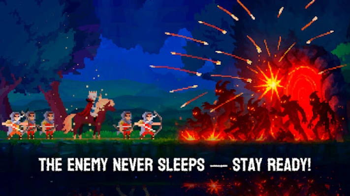 Face waves of enemies as night falls. Equip your army with swords, bows, and shields to protect your kingdom. Use tactical strategies to repel relentless invaders.