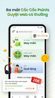 - Tích điểm - đổi quà: Nhận điểm thưởng Cốc Cốc Points khi thực hiện các hoạt động lướt web hàng ngày. Tùy ý đổi quà và tham gia nhiều trò chơi có thưởng hấp dẫn.