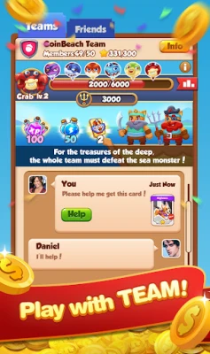 Play in team with your teamates. Get free spins and cards with the help of teamates. And finish the tasks together to beat other teams to get the big rewards!