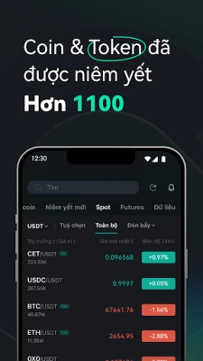 - Giao dịch Spot: giao dịch đơn giản với hơn 700 loại tiền điện tử cùng với công cụ khớp lệnh giao dịch độc quyền tự phát triển hỗ trợ lên tới 10,000 TPS.