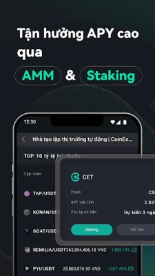 - Mọi người đều có thể tạo lập thị trường và hưởng hoa hồng 50% phí giao dịch. CoinEx đã hỗ trợ chức năng AMM cho hơn 700 thị trường tiền điện tử, mỗi thị trường đều sở hữu một pool tiền vốn. Bạn có thể cung cấp tính thanh khoản bằng cách nạp tiền vào pool và trở thành nhà tạo lập thị trường tự động. Bằng cách tham gia AMM, bạn có thể tận hưởng thêm thu nhập với mức trung bình là hơn 15% APY từ cổ tức phí giao dịch CoinEx.