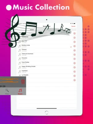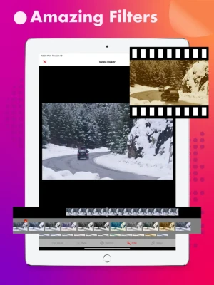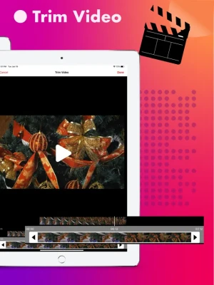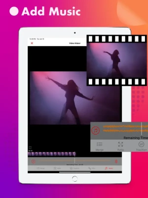 • Add background music to your videos • Trim your videos • Trim your music • Merge videos together • Apply transitions between videos • Enhance your video with filters • Import videos from photo library • Share on Facebook, Instagram, YouTube, Email and so on.