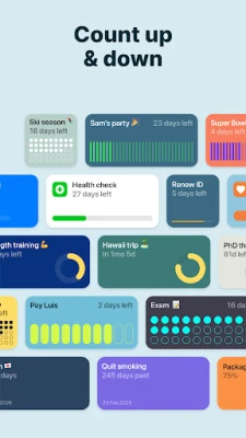 Count how many days until significant events with Pretty Progress count-up and countdown widget. A birthday countdown widget, a day tracker for quitting alcohol, or knowing the time left until a deadline – keep the motivation with ALWAYS ON reminders on your Home Screen.