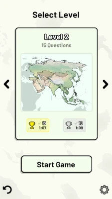 Standard quizzes allow you to learn each topic by progressing through a series of levels, each covering additional countries.
