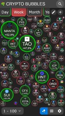 Each bubble represents a cryptocurrency and can easily illustrate different values such as weekly performance or market capitalization through its size, color and content.
