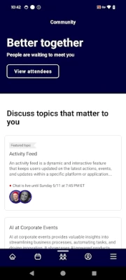 In the app: View Multiple Events – Access the different events you’re attending all from a single app Agenda – Explore the complete conference schedule, including keynotes, workshops, special sessions, and more Speakers – Learn more about who’s speaking and check out their presentations Sponsors and Exhibitors – See the event’s sponsors and exhibitors