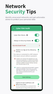 Examine your device, Wi-Fi, and cellular connection settings for possible cyber security risks. Receive expert tips on strengthening your network configurations, making it harder for unauthorized users to break in.